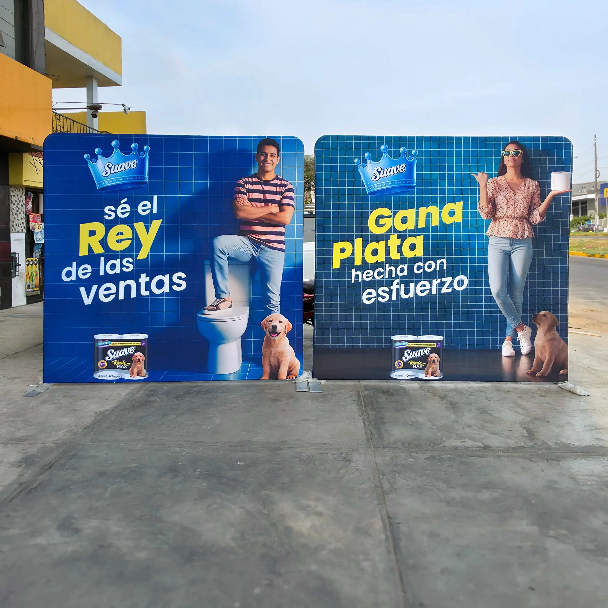 También conocido como display de tensión publicitario, en esta presentación recta, cuenta con una base más larga y más pesada, la cual lo hace perfecto para tu publicidad en exteriores.