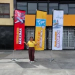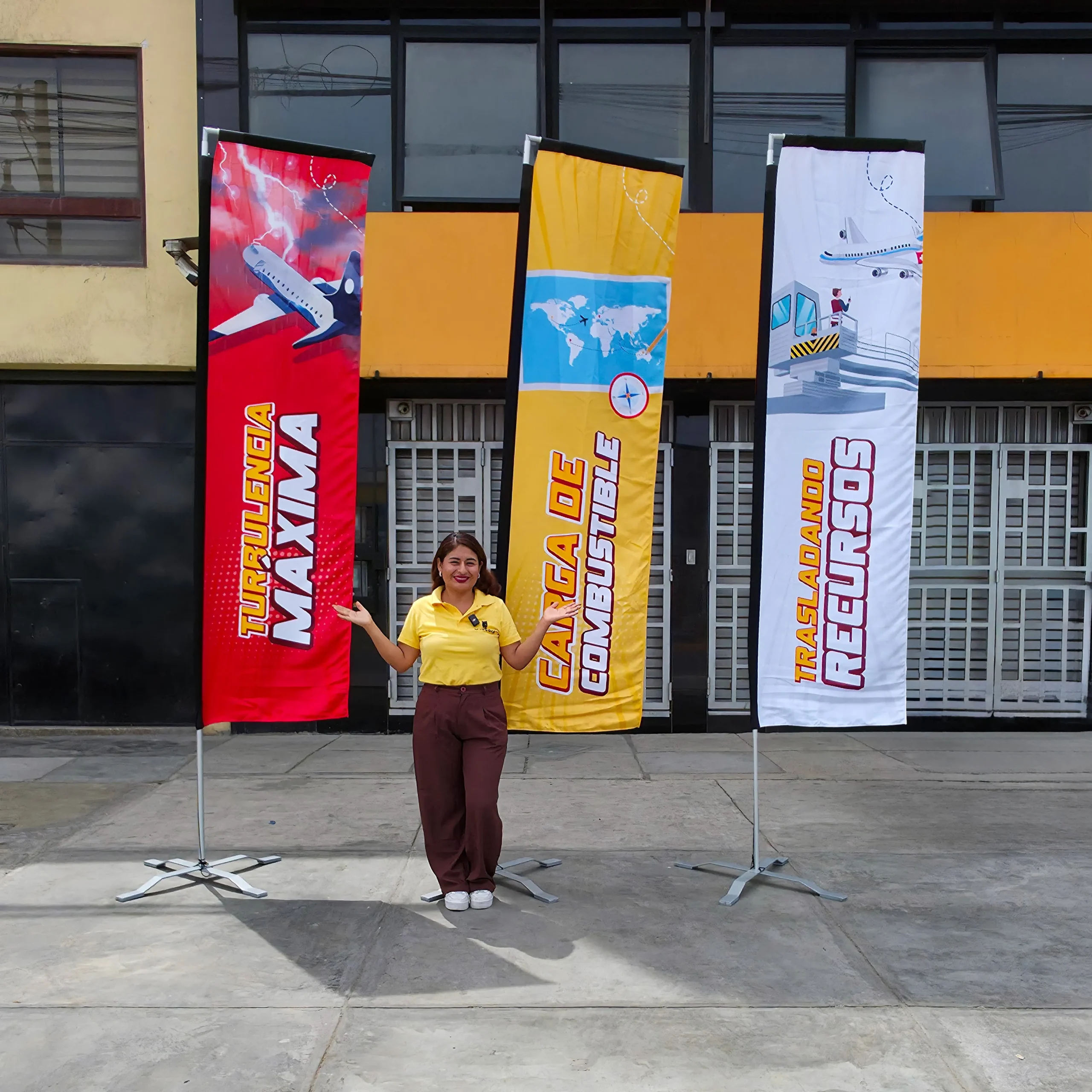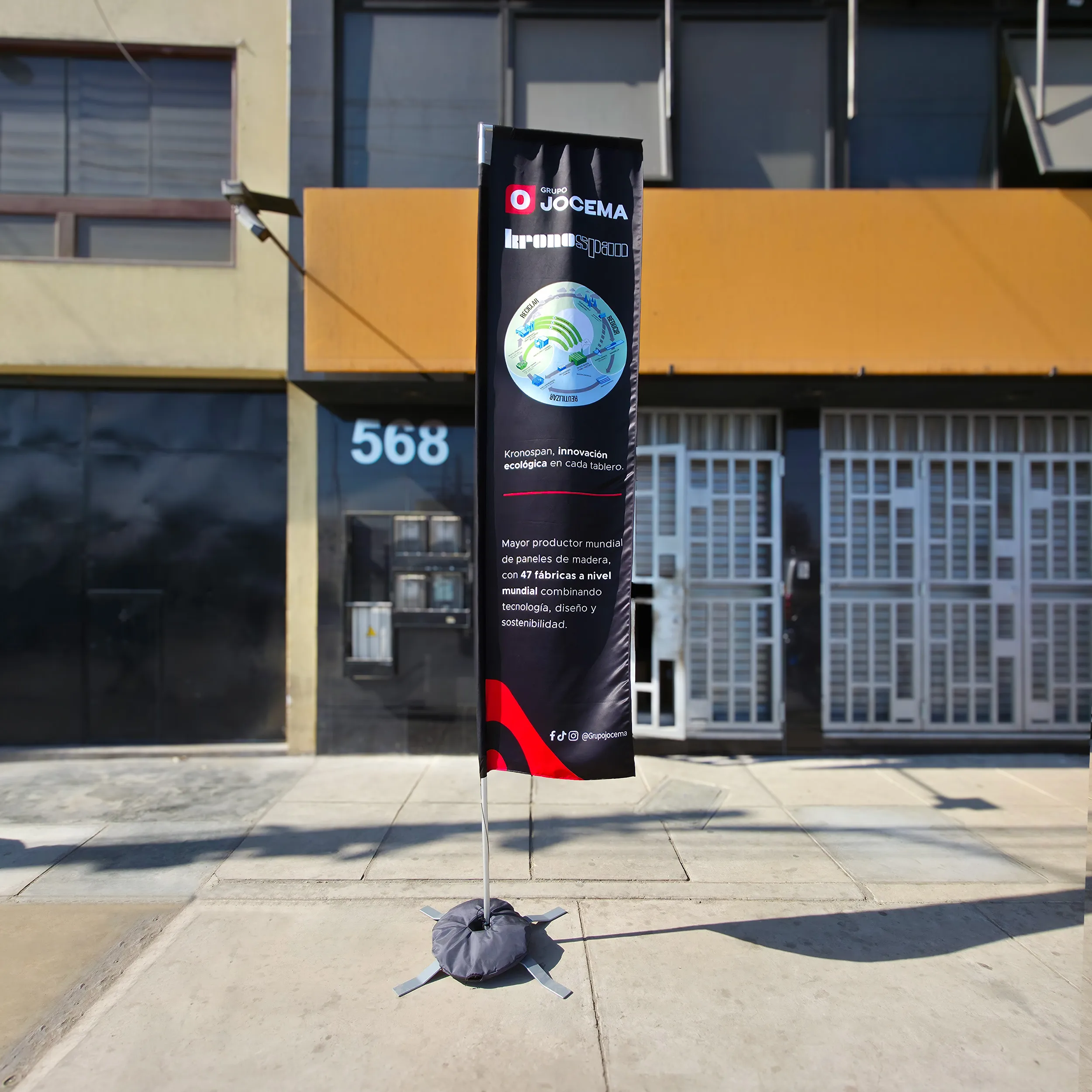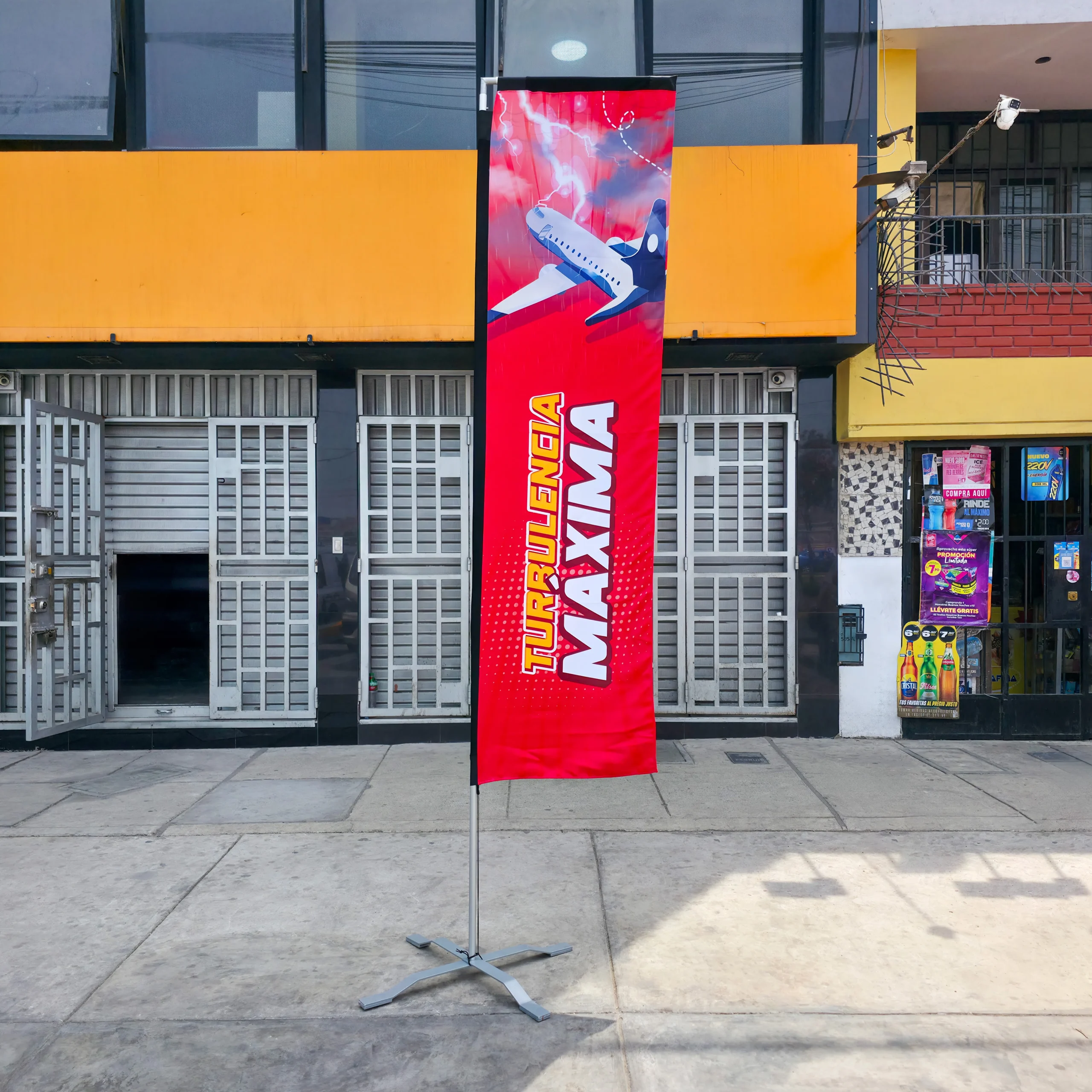 Banderola tipo L invertida, perfecta para tus eventos en exterior, destacarás tu marca con tu gráfica en forma rectangular y totalmente personalizada en una o en ambas caras, elaboradas 100% en tela sublimada.