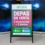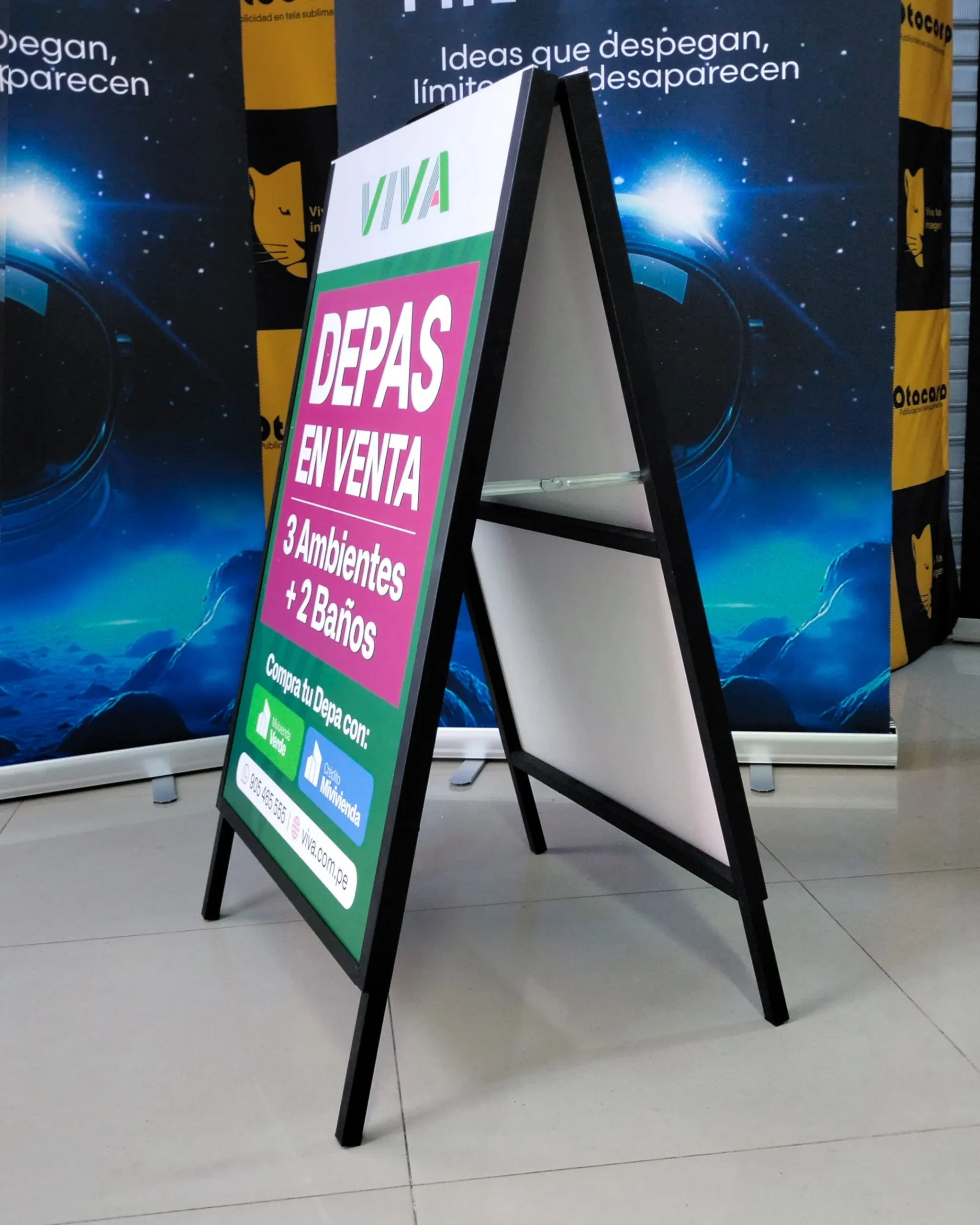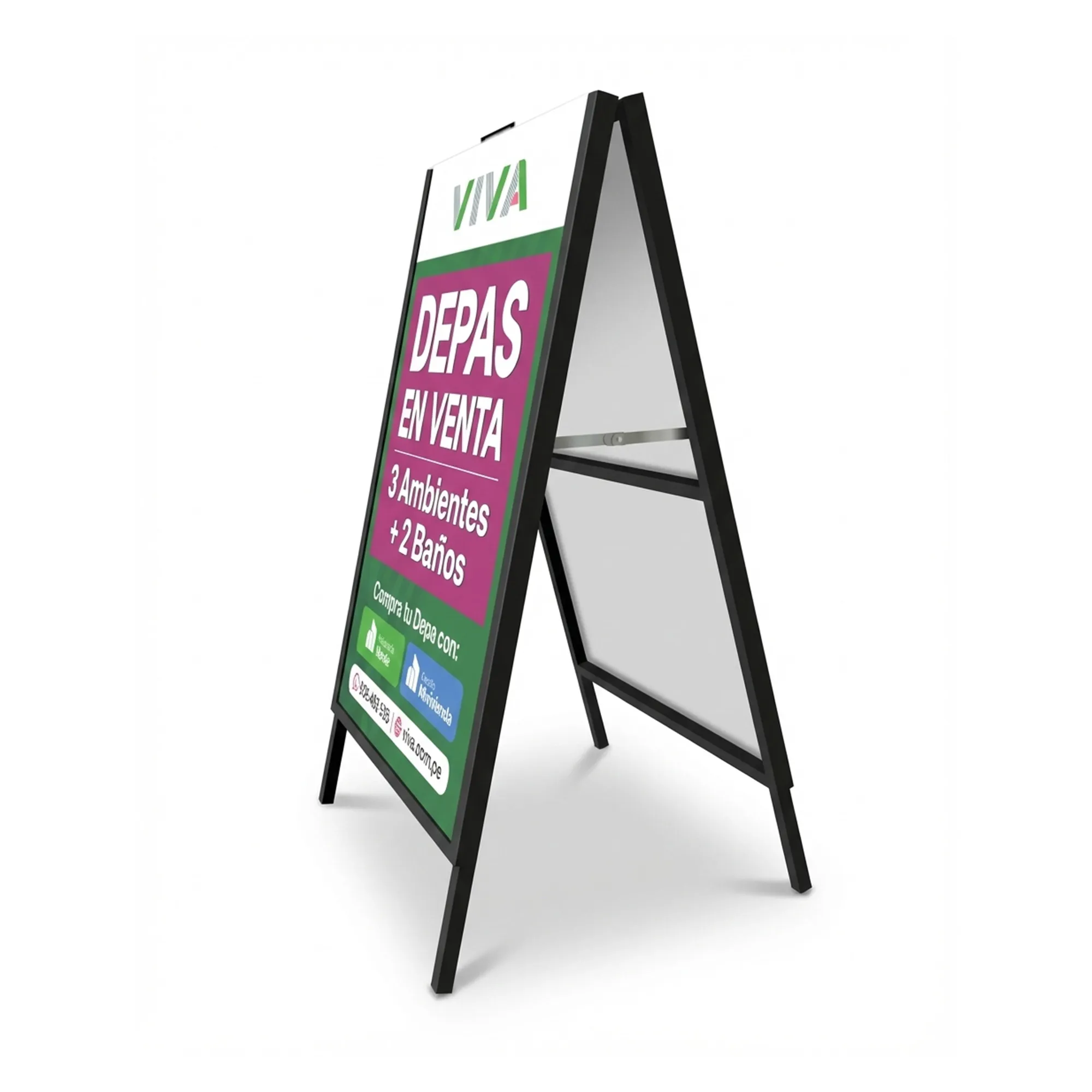 También llamado caballete tipo «A» o exhibidor portátil doble lado nacional.