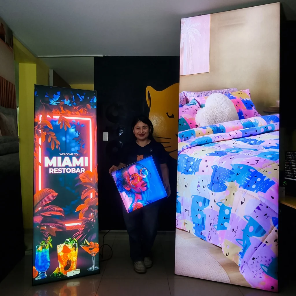 Nuestros paneles led, también llamados cuadros led, pantallas led o cuadros luminosos, son una novedosa manera de poder atraer la atención de tus clientes. Su grosor es delgado lo cual lo hace un producto versátil para poder colocarlo donde quieras, ya que incluye todos los accesorios por si lo deseas colgarlos en las paredes y apoyadores para colocarlos en escritorios en el caso de los cuadros más pequeños.