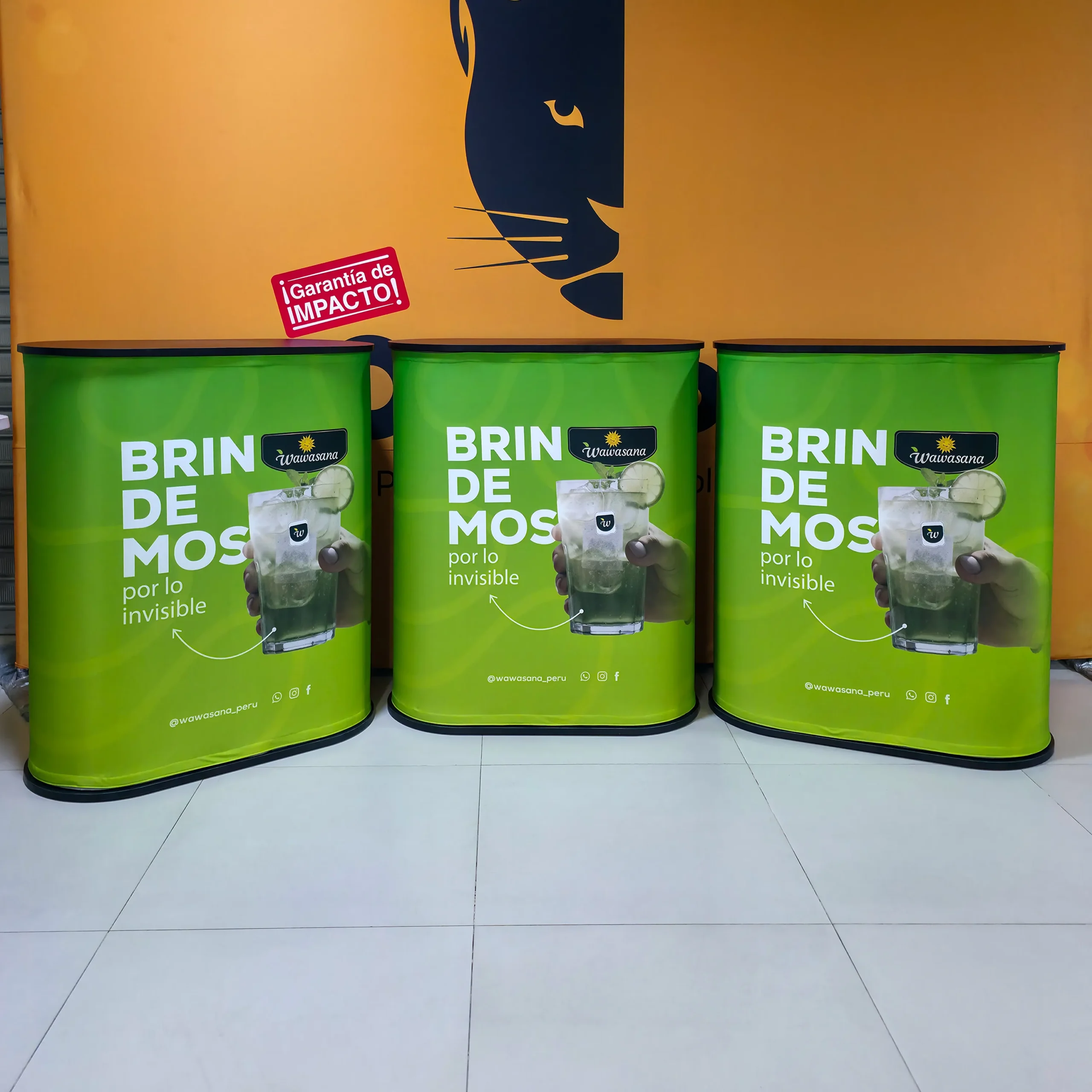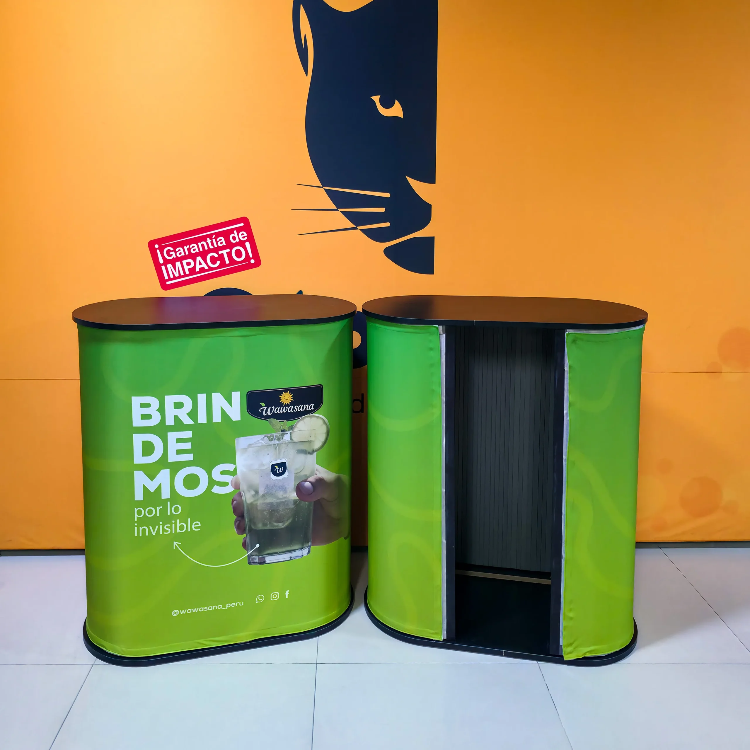 También conocido como counter enrollable o mesa ovalada enrollable, es perfecto para cualquier evento o activación que puedas tener.